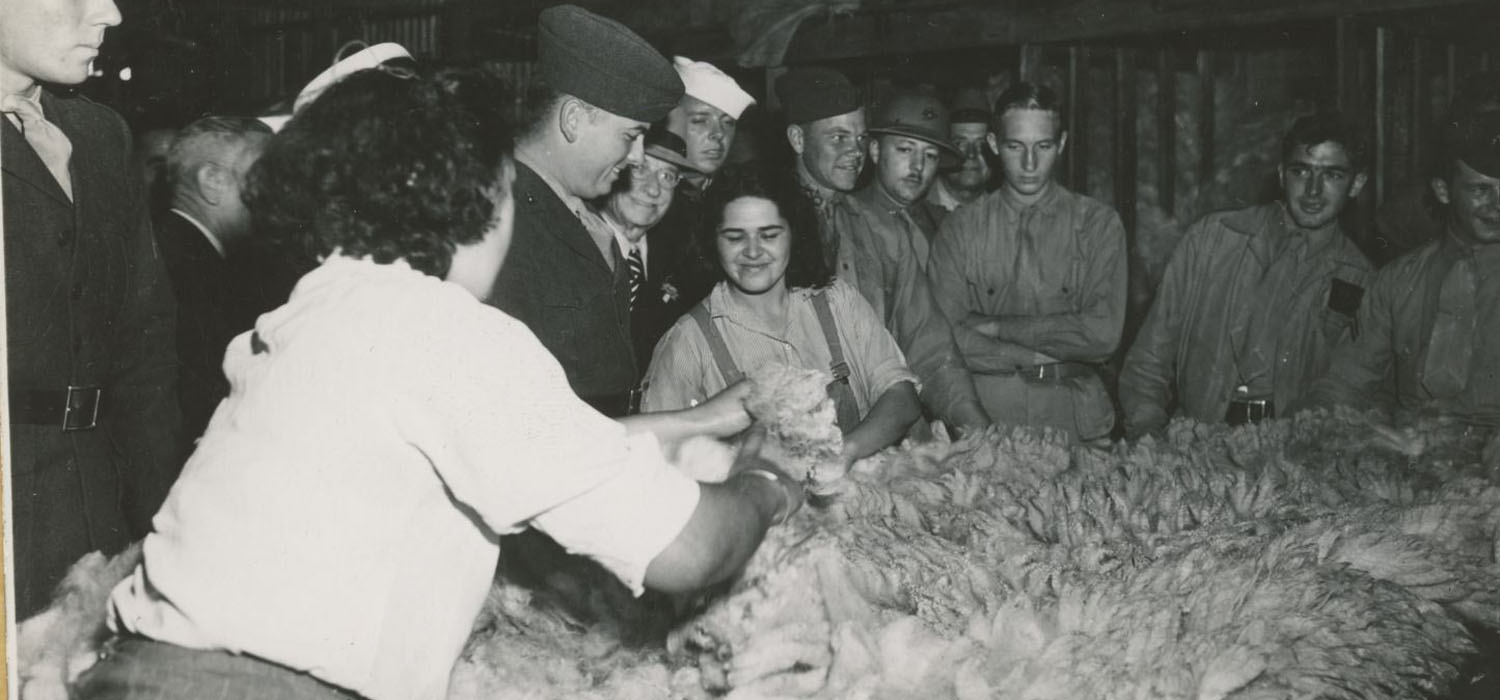 A group of Marines watch the girls rolling and classing the fleece. Sheep are the Romney Cross breed.